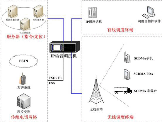 IP语音调度系统由IP语音调度机、有线调度终端、无线调度终端组成,其中IP语音调度机是整个系统的核心,负责处理基本语音的交换及调度功能的实现。