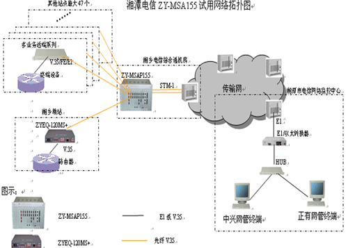 北京正有公司的ZY-MSAP155作为接入设备,上联到由华为公司构建的本地传输网上,接口为155M的(STM-1)SDH光接口,其中局端设备ZY-MSAP155安装在湘乡电信综合机房(与华为公司传输设备同机房),远端设备ZYEQ-120MS+安装在湘乡粮站,通过光缆和局端设备相连。网管终端安装在湘潭市电信网络监控中心,与被管理设备距离30公里,通过传输网的2M通道建立网管链路,实现异地管理。