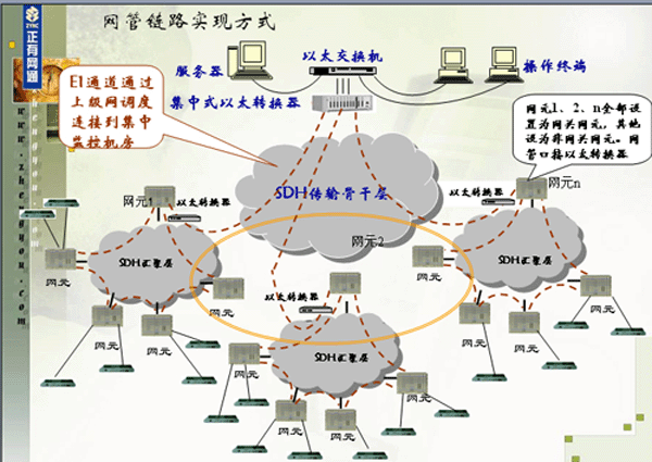 每台ZY-MSAP155设备采用2块MCU板,其两个155光口连到骨干网设备上,另两个155光口完成MSP保护。业务盘选用TUOP4 、TUOM2 、TUOS2和TUOFE四种,TUOP4光盘连接到位于客户处的远端PDH单元,提供E1和V.35业务。 TUOM2和TUOS2用于连接位于客户处的远端SDH/MSTP和PDH/MSTP单元,提供E1和FE业务。 TUOFE用于连接到位于客户处的光纤收发器远端设备,提供FE业务。网管方式为一台网管PC,与网内任意一台ZY-MSAP155相连;通过ZY-MSAP155设备MCU上的两个155光口的第63个VC12时隙为网管链路,通过骨干网的时隙调度,将接入层的全部设备的网管时隙分别连起来,形成一个环。