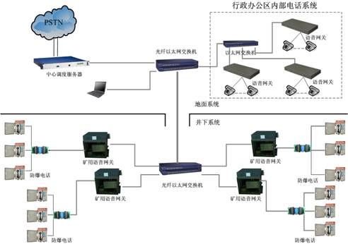在现有网络资源不改变的情况下,我们选择在地面机房直接架设一台IP调度机,地面办公区域部署常规语音网关,井下部署矿井专用语音网关,充分利用原有的模拟电话线路和电话机终端,地面和井下通过一根主干光纤进行通信数据的传输。这样就实现了所有内部分机的互通,同时IP调度机配备FXO口板卡后,可以将原先接在程控交换机HJD-256上的2条中继线接到IP调度机上,从而组成和原有使用习惯完全相同的电话系统。