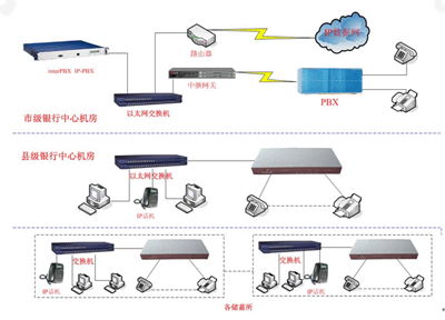 银行系统及各区县分行都已经建设有自己的网络以及通信系统。为了满足当前银行系统与各区县分行间因为工作而日益发展的通信需求,我公司建议在现有的数据网络上利用VoIP技术来实现语音通信业务。在国家政策的层面上,我国将IP电话归类为电信增值业务,不必承担电信运营商所受的管制规定。技术层面上,随着数字信号处理器和集成电路生产技术变得非常成熟,IP传输技术在实时性和服务质量方面得到了长足发展,VoIP产品在很低的带宽下,就可以保证语音应用的实时性和通话质量。