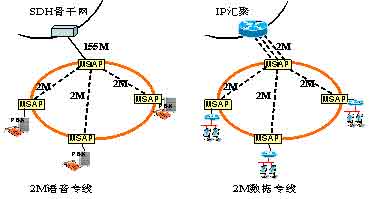 2M专线业务是专线业务中主流的业务,运营商提供给高端商业用户和大客户一般都使用2M专线。由于MSAP是基于SDH的多业务接入平台,因此保留了SDH优秀的组网能力和完善的保护机制,可以灵活的组成点对点、线性和环型网络,可以提供SNC保护。由于本质上是TDM 2M业务,因此可以提供极高的业务质量,保证大客户的需求。根据客户的不同需求,一般可以提供2M语音专线和2M数据专线,如下图所示。