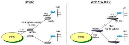 在传统的铜线环路上,运营商可以为用户提供Nx64K专线服务。大客户的企业路由器提供V.35接口,通过协议转换器或调制解调器将V.35接口转换成G.703口,然后通过传统的2M环路将大客户的数据业务接入IP汇聚网络。由于铜线环路的广覆盖,这种专网形式非常普遍,但这种专网只能提供3-5km的传输距离,非常有限。对于那些没有铜线环路覆盖的客户,铺设光纤比铺设铜线便宜,而且光纤的传输距离远远大于铜线。
