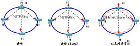 以太网共享环是指每个MSAP节点和相邻的节点之间的WAN口都建立一个通路,这样形成一个逻辑上的环路。这个环也就是提供给以太共享环的底层传输通道。当有数据报上环时,设备采用单向传送的方法,即进来的数据包往环的一个方向前传,直到在终结点进行终结。这种方式极大的节省了带宽,但安全性相对比较低,所以适合上网浏览用户。