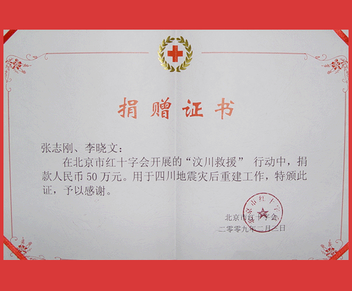 在北京市红十字会开展的“汶川救援”行动中,正有公司董事长张志刚夫妇个人捐款人民币50万元,以正有公司的名义,代表正有公司全体员工在四川省灾区捐建“正有回龙学校”。用于在地震中失去校舍的孩子们能够重返校园,让在此次地震中幸存的孩子过上无忧无虑的生活。 下面是北京市红十字会为表示感谢颁发的证书: