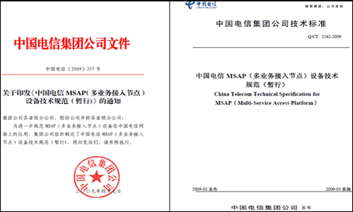 2009年4月7日,中国电信集团为了进一步规范该系列产品在中国电信网络上的应用,发布了中国电信【2009】357号《关于印发〈中国电信MSAP(多业务接入节点)设备技术规范(暂行) 〉的通知》的文件,明确将正有公司自主研发的MSAP(多业务接入节点)设备作为行业标准予以实施,以提高边缘接入网行业标准的权威性、严肃性、可行性和指导性。
