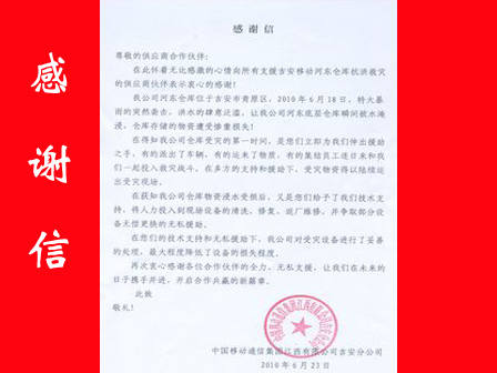 2010年6月18日,特大暴雨的突然袭击,洪水的肆意泛滥,使得中国移动江西吉安分公司的河东仓库瞬间被水淹没,仓库存储的物资遭受惨重损失!面对突如其来的灾情,为确保抢险救灾通信畅通,正有公司迅速启动防汛通信保障预案,立刻组织动员公司人员全力投入抢险抗灾工作,将洪灾对通信的影响降到低点。