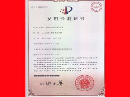 继2008年1月正有公司MSAP接入网设备被国家知识产权局授予国家“实用新型专利”后,公司在2010年8月再次获得国家“发明专利”,专利号为ZL 2006 1 0127210.2。 这是2008年公司自主研发并获授权的第二项国家专利。