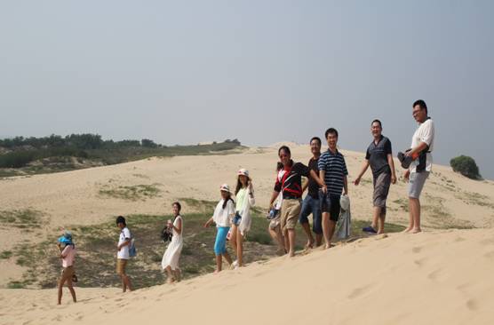 第二天一大早,大家驱车来到了此次旅行的第二站:素有“京东大沙漠”之称的翡翠岛,其东、北、西三面由渤海和七里海环绕,是一座由黄色细沙和绿色植被相间构成的半岛,岛上沙山连绵起伏,造型优美,不失为海洋中的沙漠。