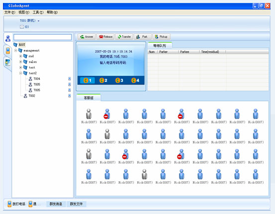 集成了标准的IP 软电话功能,安装在坐席的工作电脑上,配合耳机/麦克,就可以方便的拨打和接听电话。并具备速拨、电话转接、保留、即时会议、传送数据、免打扰、即时消息、设置状态、通话记录和通讯录、登录/退出工作组功能等各种功能。班长坐席软件具有监听、插话,等待队列监控、查看工作组状态等高级管理功能。