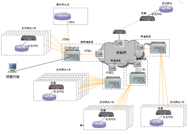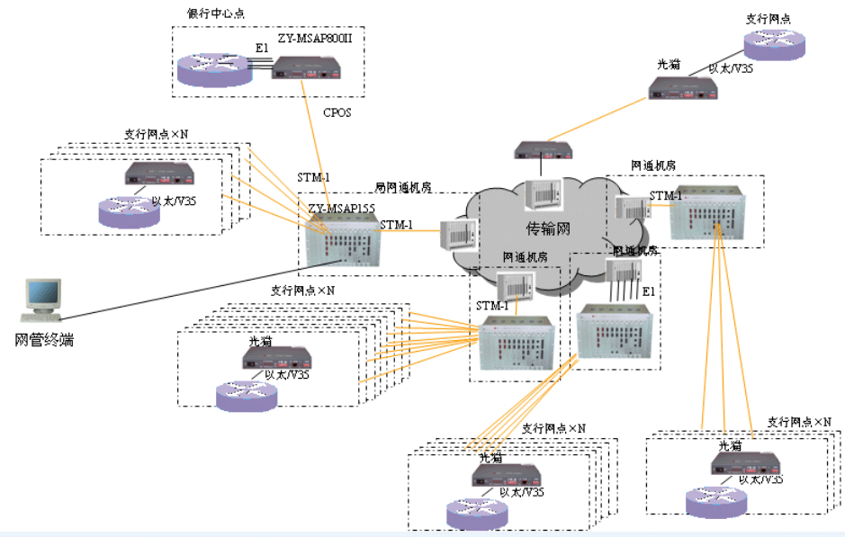 在银行网改造中,采用MSAP是非常理想的解决方案,由于网点多、分布广、可靠性要求高,采用SDH/MSTP方案造价昂贵,网络结构不合理;而采用PDH/光猫+协转方式,虽然设备成本低,但网络运行维护难度大,无法实现网络管理。MSAP方案融合各种接入技术,使得E1、V35、FE等各项业务由一个平台实现,业务带宽任意调整,网络保护和网络管理功能完备,建设和维护成本都相对低廉。是优化的银行网解决方案。以下是银行网接入解决方案的典型网络拓扑图。